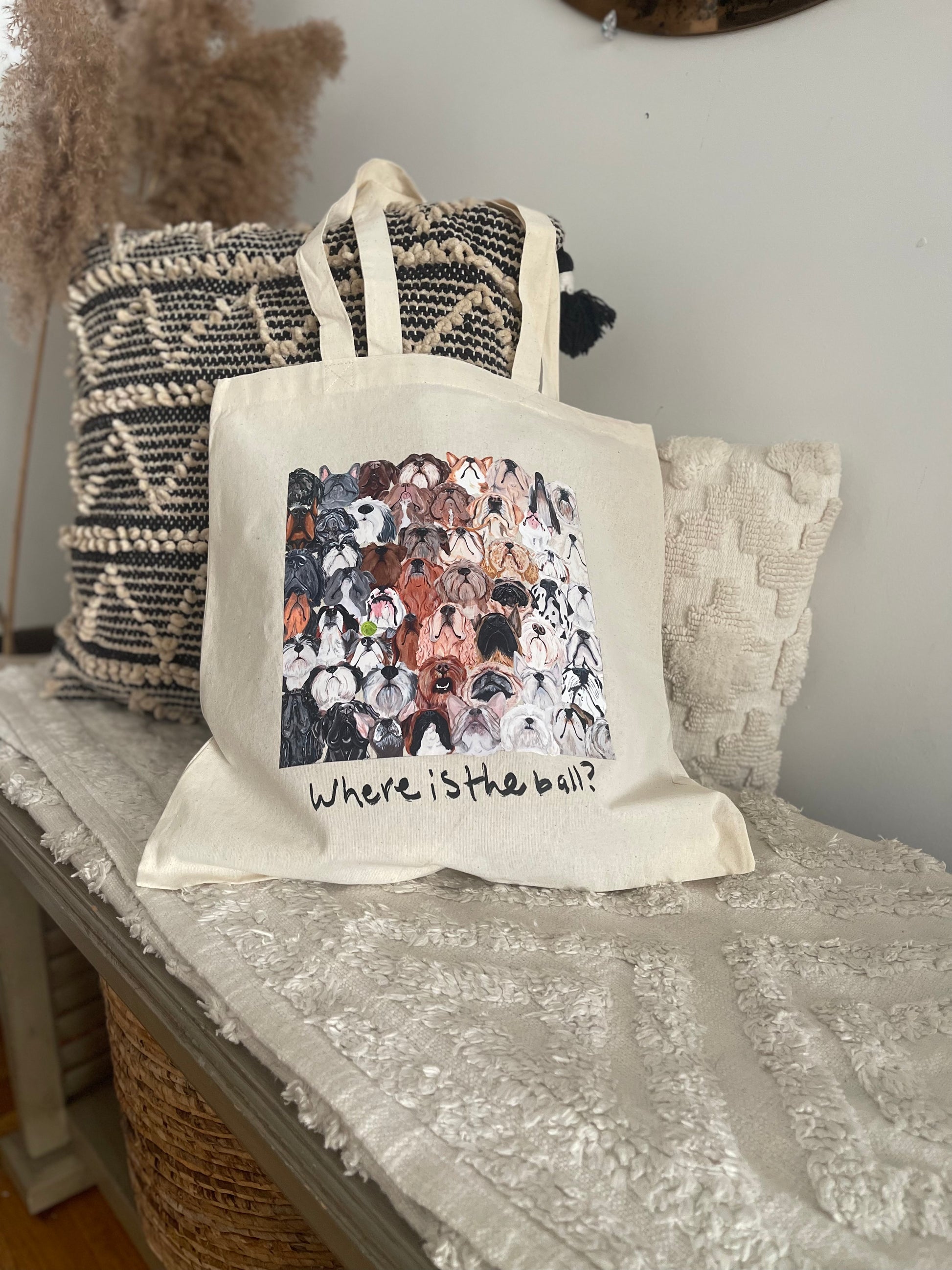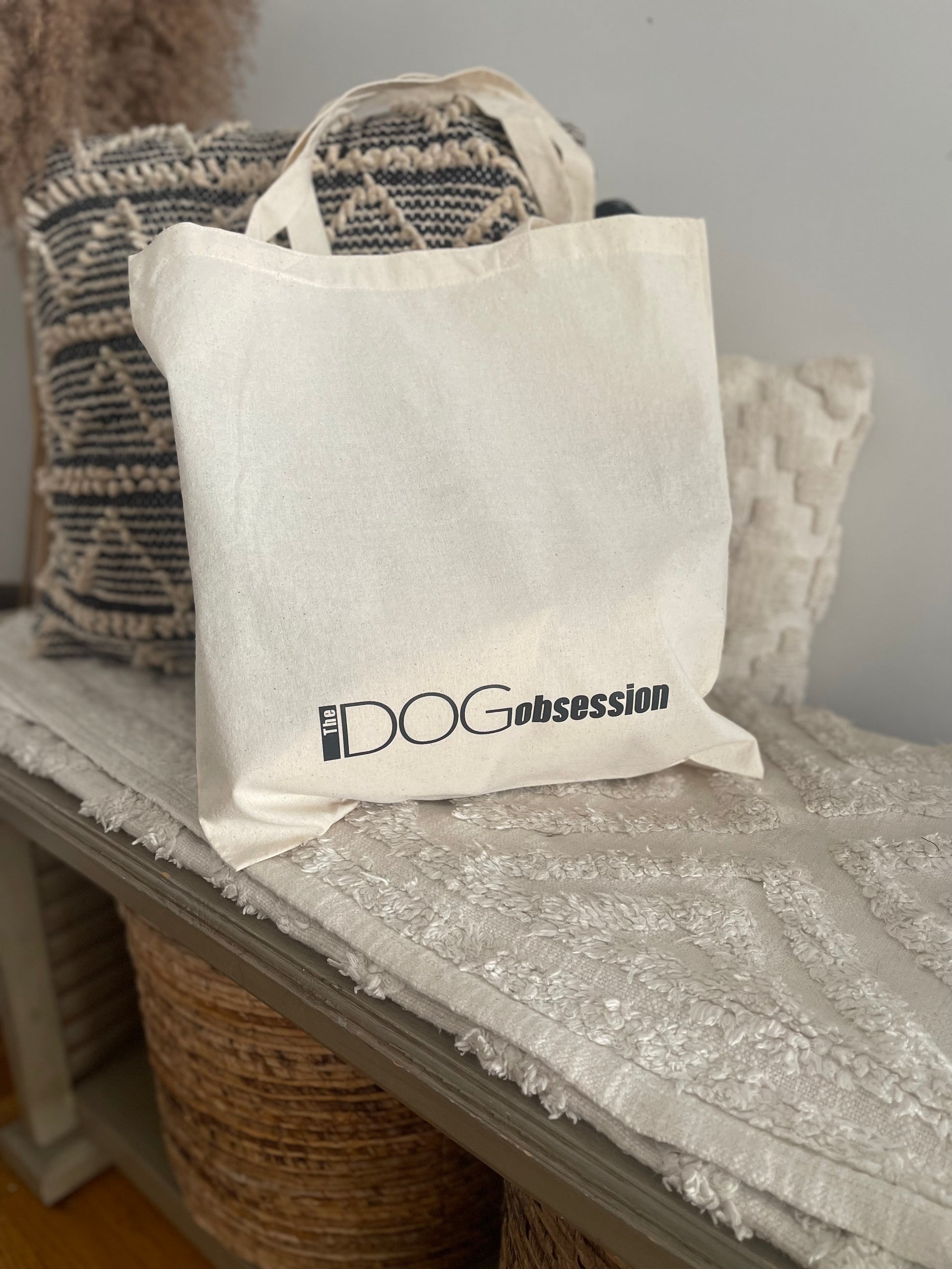 Our totes are 15"W x 16"H, made of 100% 5oz natural cotton, lock stitching inside, with compacted stitching throughout, including cross-stitching at the handles for maximum strength. And of course our signature nose-up dog art in them.