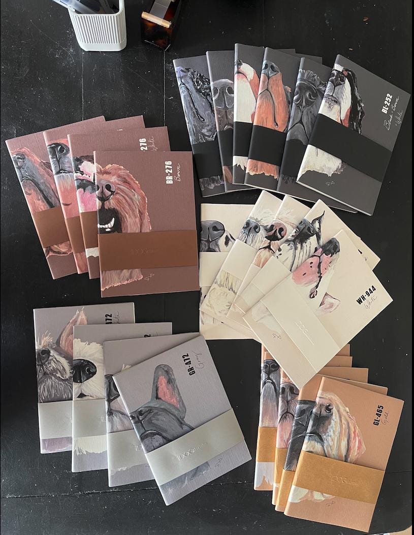 This 100% handmade Dog Notebook features our signature nose-up dog art printed on a quality linen-finish cover. Compact and durable, it includes 68 blank pages with saddle stitch binding—ideal for journaling, sketching, or quick notes wherever you go. Stylish and small, it’s the perfect way to keep your dog close even when you’re apart.